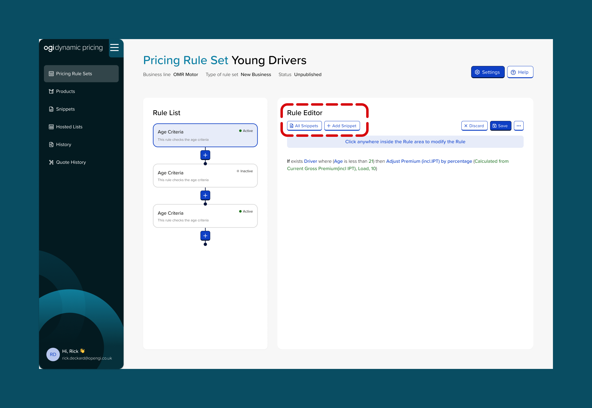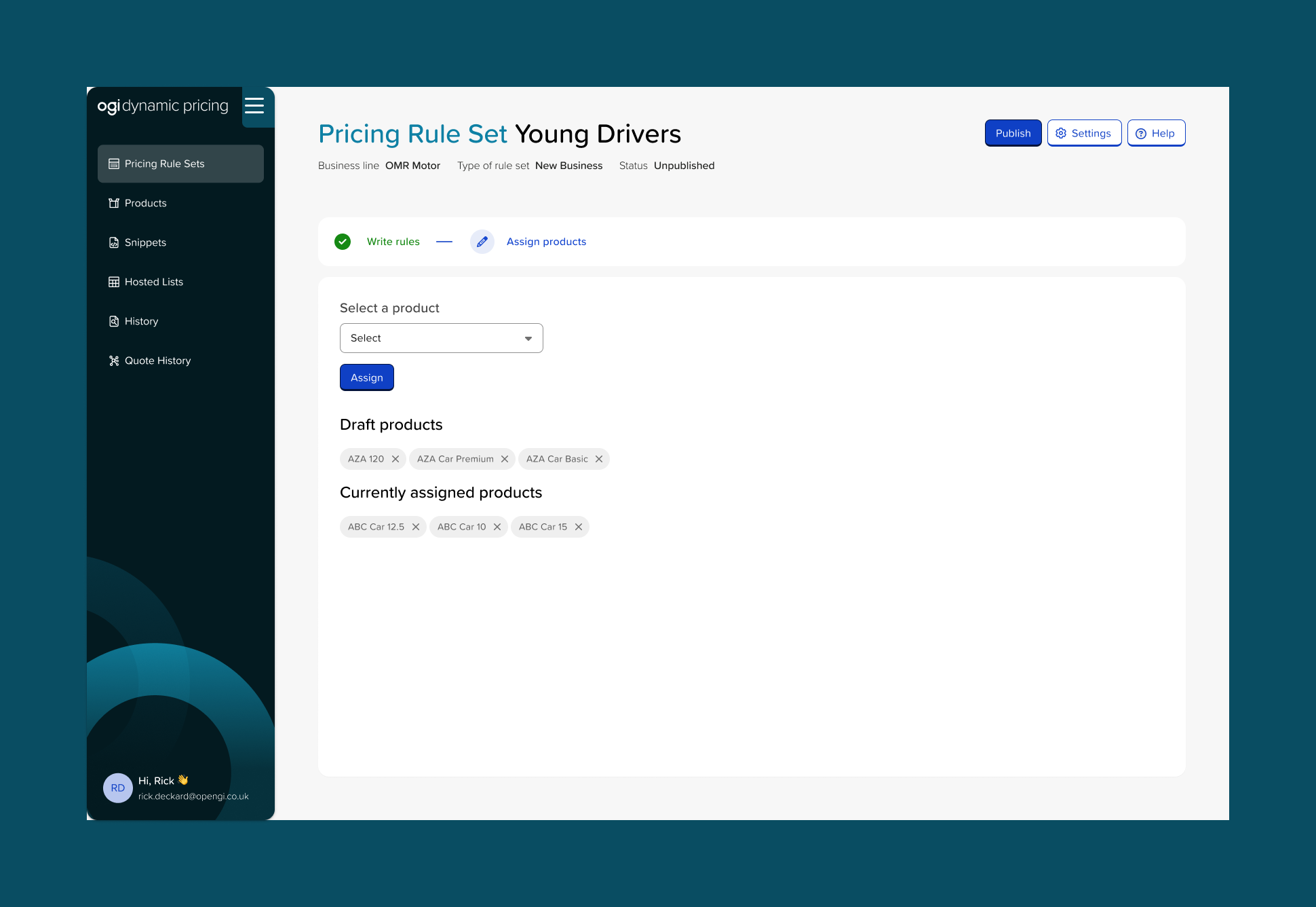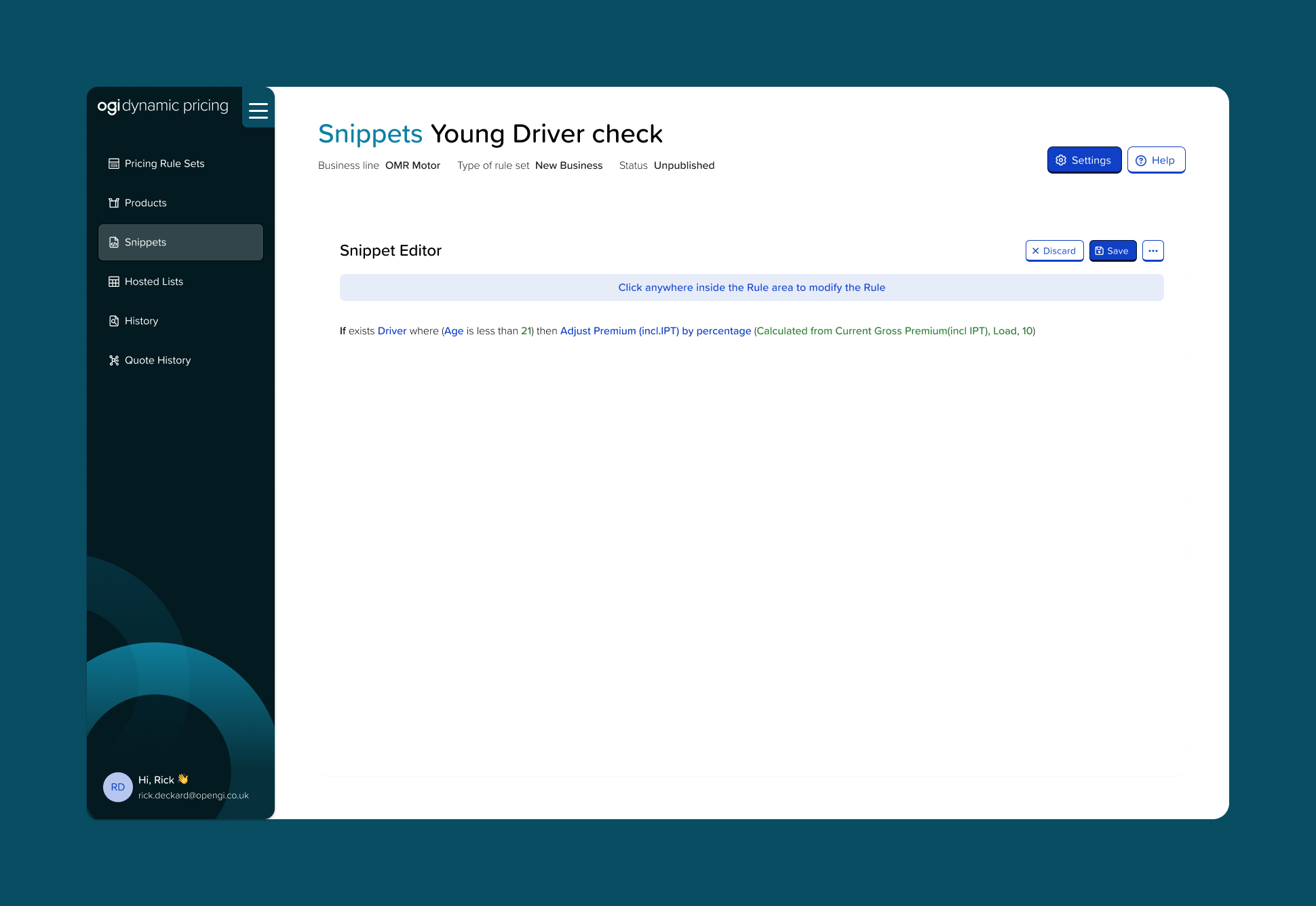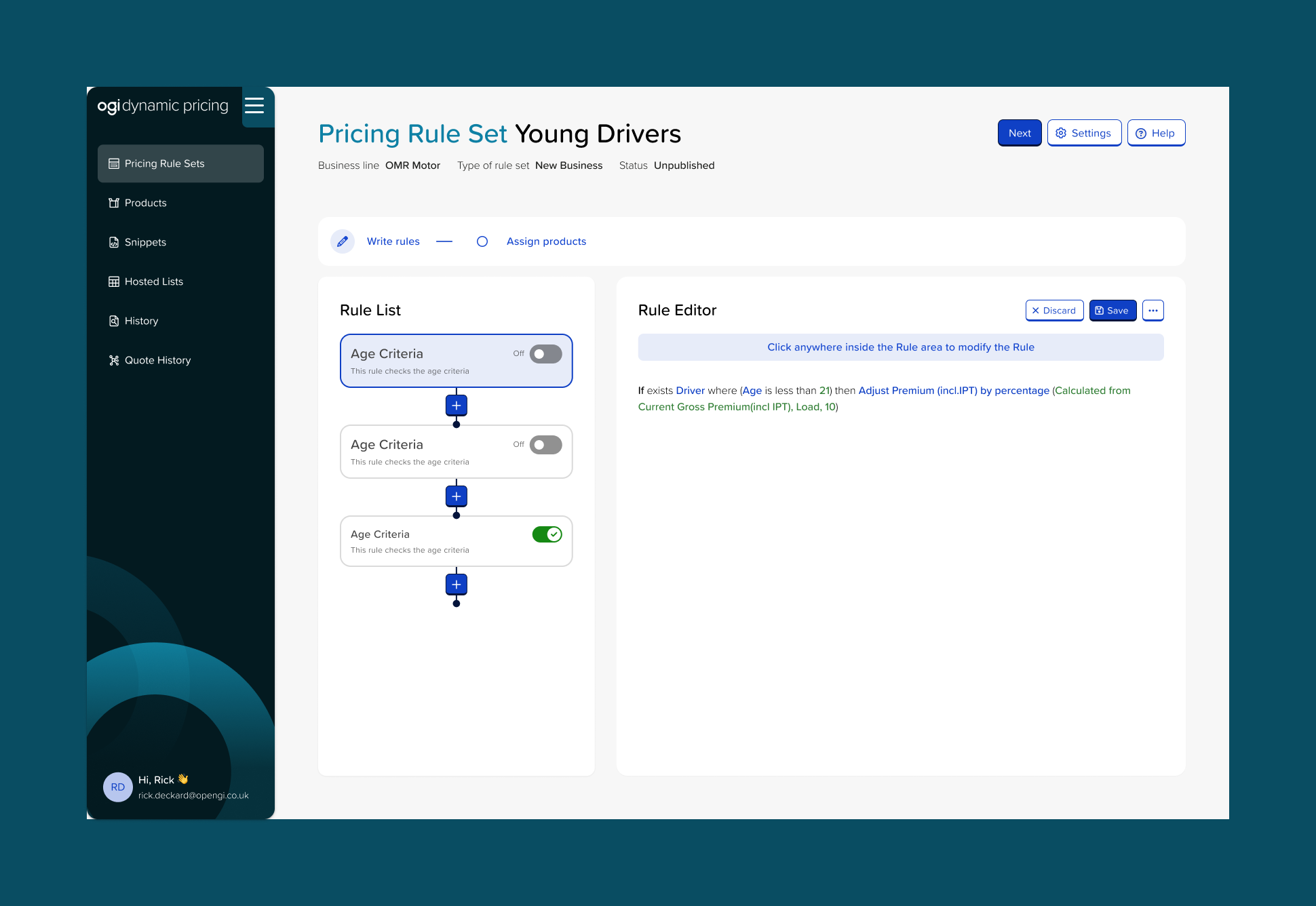 DPT is now live with three clients. Brokers use it to automate pricing strategies that once required spreadsheets. The product handles many scenarios like loadings and discount which can be based on age, no-claims bonuses, club membership discounts; Alternative outcomes can be automatic decline or refer rules for high-risk quotes.
